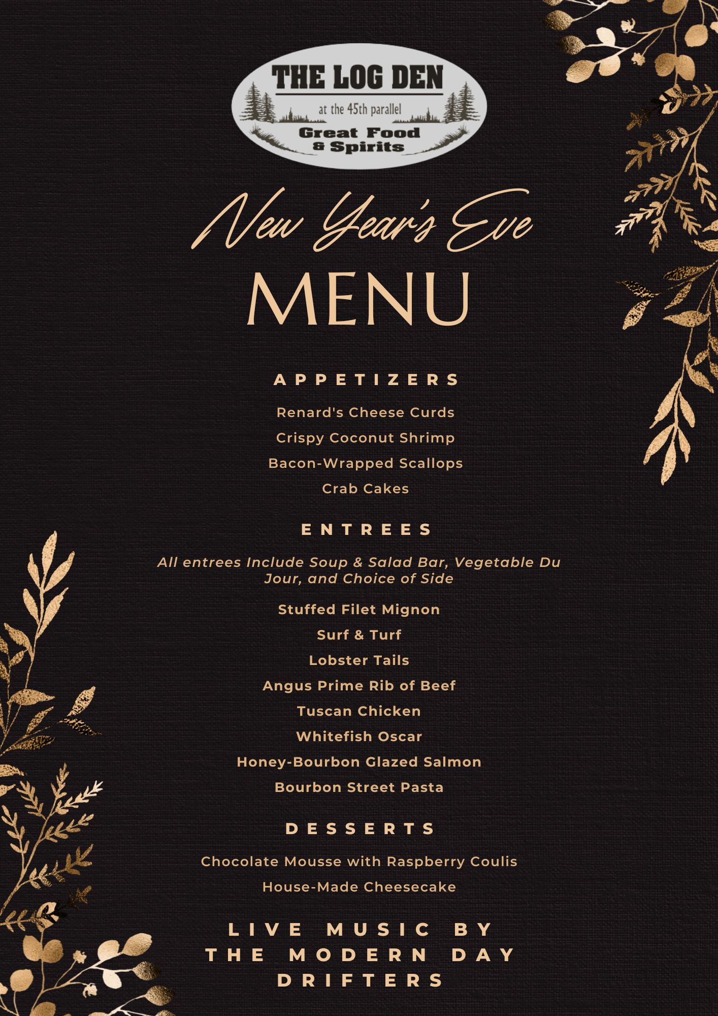 Join us for New Year’s Eve, featuring a special menu and live music by the Modern Day Drifters! Call 920-868-3888 for reservations.